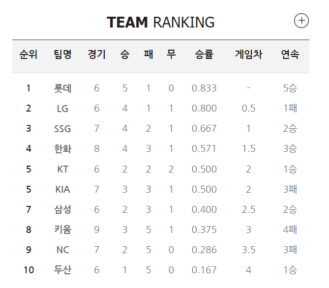 시범경기에서는 롯데, LG, SSG 가 강세를 보이고 있네요